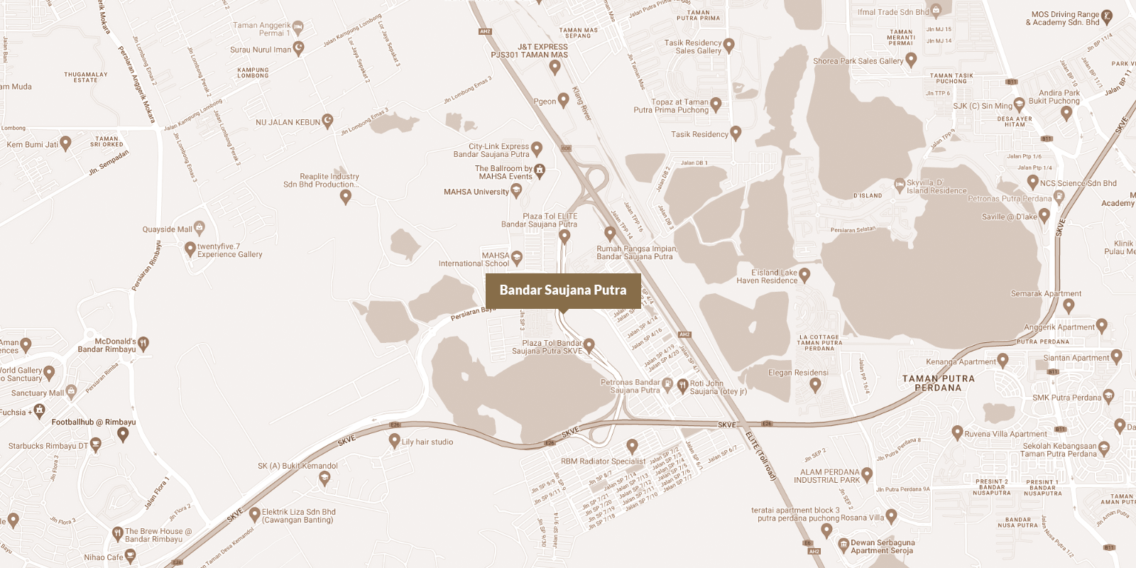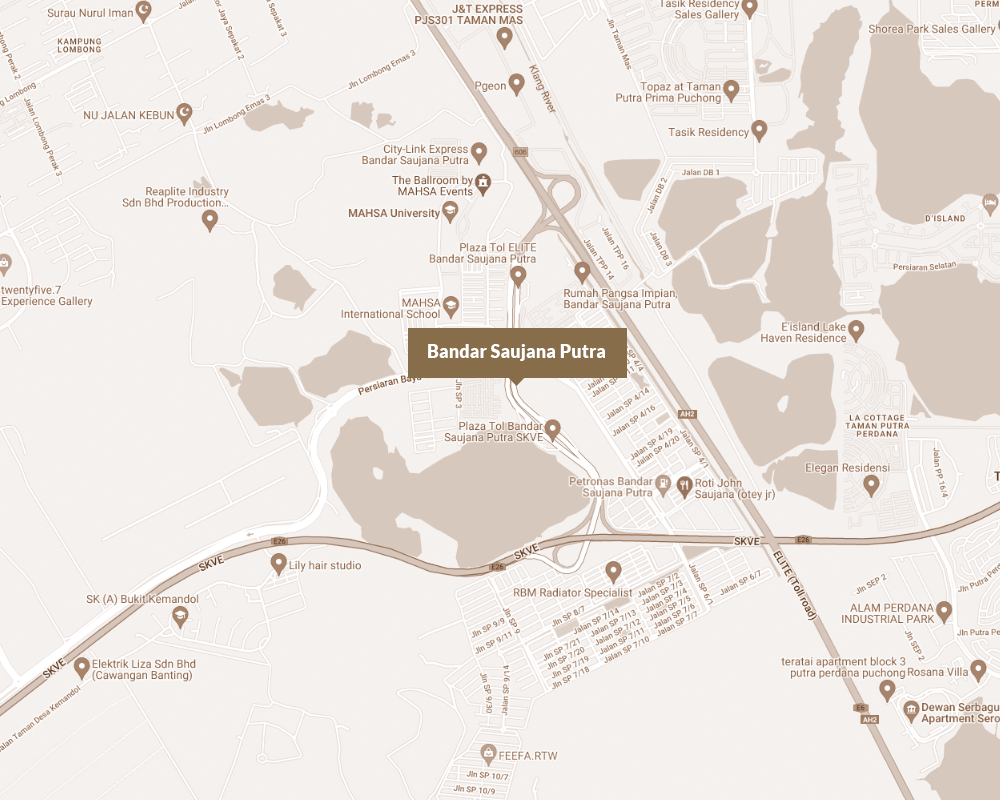 A self-sustaining township located south of Puchong, Bandar Saujana Putra is nestled between USJ, Putrajaya, Cyberjaya and Shah Alam. It is made accessible via the ELITE, SKVE and LDP highway, making it perfect for those looking to escape the hustle and bustle of the city, yet remain close to the major cities of Petaling Jaya and Kuala Lumpur.